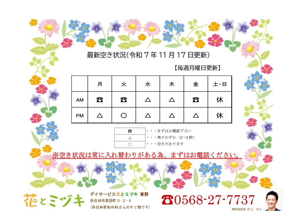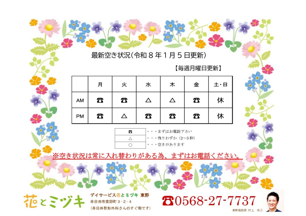 花とミヅキ東野です。リハビリ・入浴・マッサージ・おやつ・食事をすべて利用して頂く事ができ、アットホームな居心地の良さが特徴の、半日型の地域密着型通所サービスです。お気軽にお問合せ、ご見学、ご体験にお越しください。