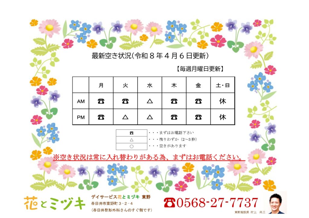 花とミヅキ東野です。リハビリ・入浴・マッサージ・おやつ・食事をすべて利用して頂く事ができ、アットホームな居心地の良さが特徴の、半日型の地域密着型通所サービスです。お気軽にお問合せ、ご見学、ご体験にお越しください。